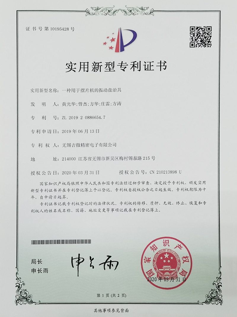 一種用于擺片機(jī)的振動(dòng)盤治具實(shí)用新型專利證書