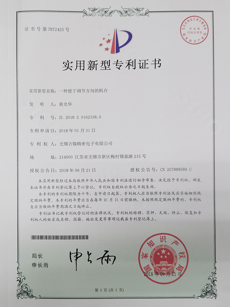 一種便于調(diào)節(jié)方向的機(jī)臺(tái)實(shí)用新型專(zhuān)利證書(shū)