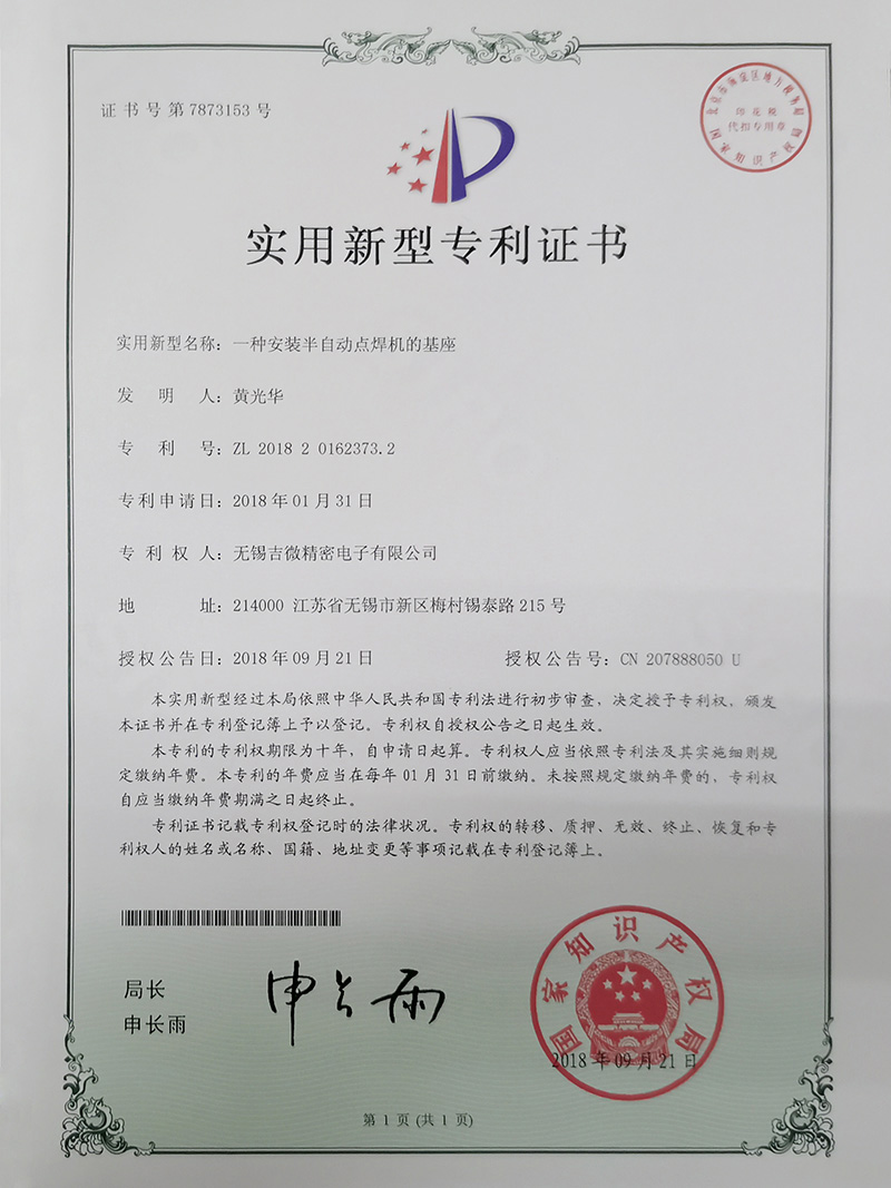 一種安裝半自動(dòng)點(diǎn)焊機(jī)的基座實(shí)用新型專利證書